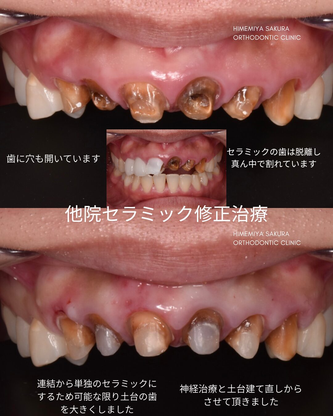 モニター様ご紹介 20代女性 20代前半の頃大阪にある有名審美歯科で前歯6本のセラミック矯正治療を受けた。強い痛みはないが、歯茎は赤黒く腫れていて真ん中で割れて、すでに連結してあるセラミックが脱落している状態です。とご相談くださいました。 初診時の状態 白い6連結のセラミックがありますが。右側の前歯は破折しています。(写真左)また6連結の中央でジルコニアのフ …