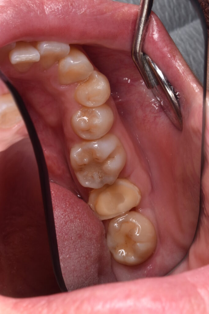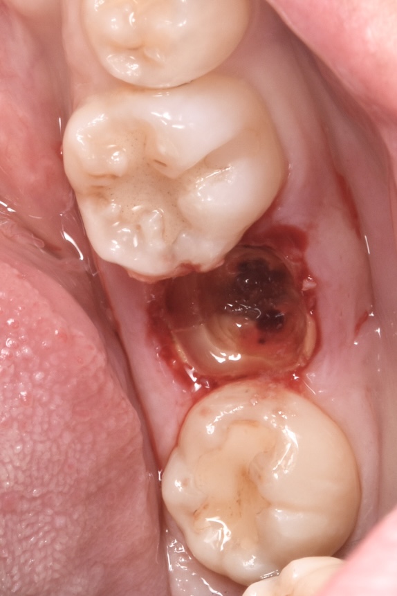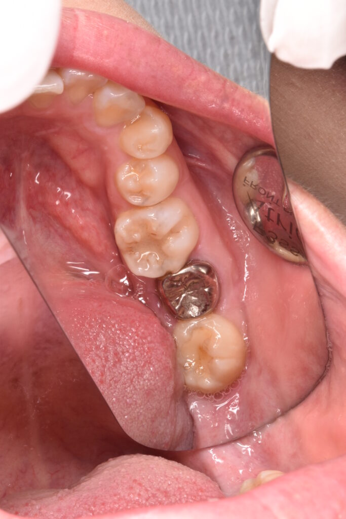 30代女性 喫煙歴なし 下の歯の銀歯が噛むと痛いと違和感を訴えご来院されました。部分CTやレントゲン等で検査し確認したところ歯の真ん中で割れていることがわかり抜歯となりました。