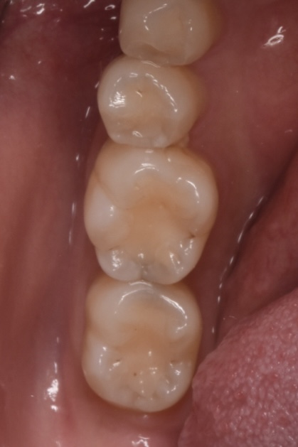 写真は左下の奥歯です。奥歯の大臼歯の間に黒くなっているところがわかります。ここが虫歯です。歯と歯の間から虫歯になっています。2本とも修復がされているためその下も虫歯が広がっている可能性が高いです。(肉眼ではわかりません)