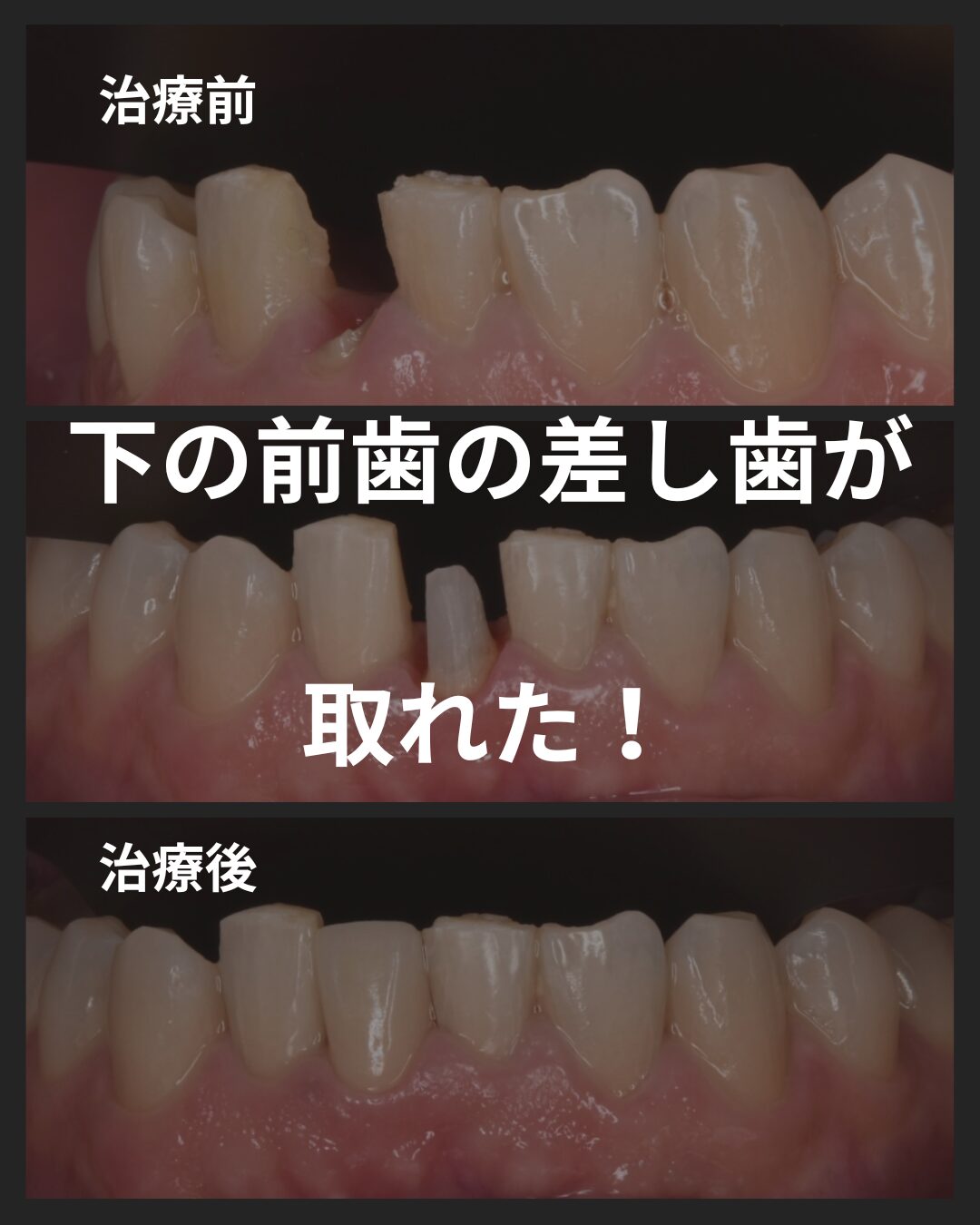 前回までの投稿はこちらから モニター様紹介 50代男性 東京で治療した差し歯が取れたとご相談くださいました。今回は歯が折れていたためにそのままでは治療できず、残っている歯を2ミリほど引っ張り出してもう一度ご自身の歯で生活を送って頂きたいと思い意図的挺出をご提案しその治療結果になります。 治療前後 治療経過 途中で折れている歯を矯正用のゴムを用いて牽引し、約2 …