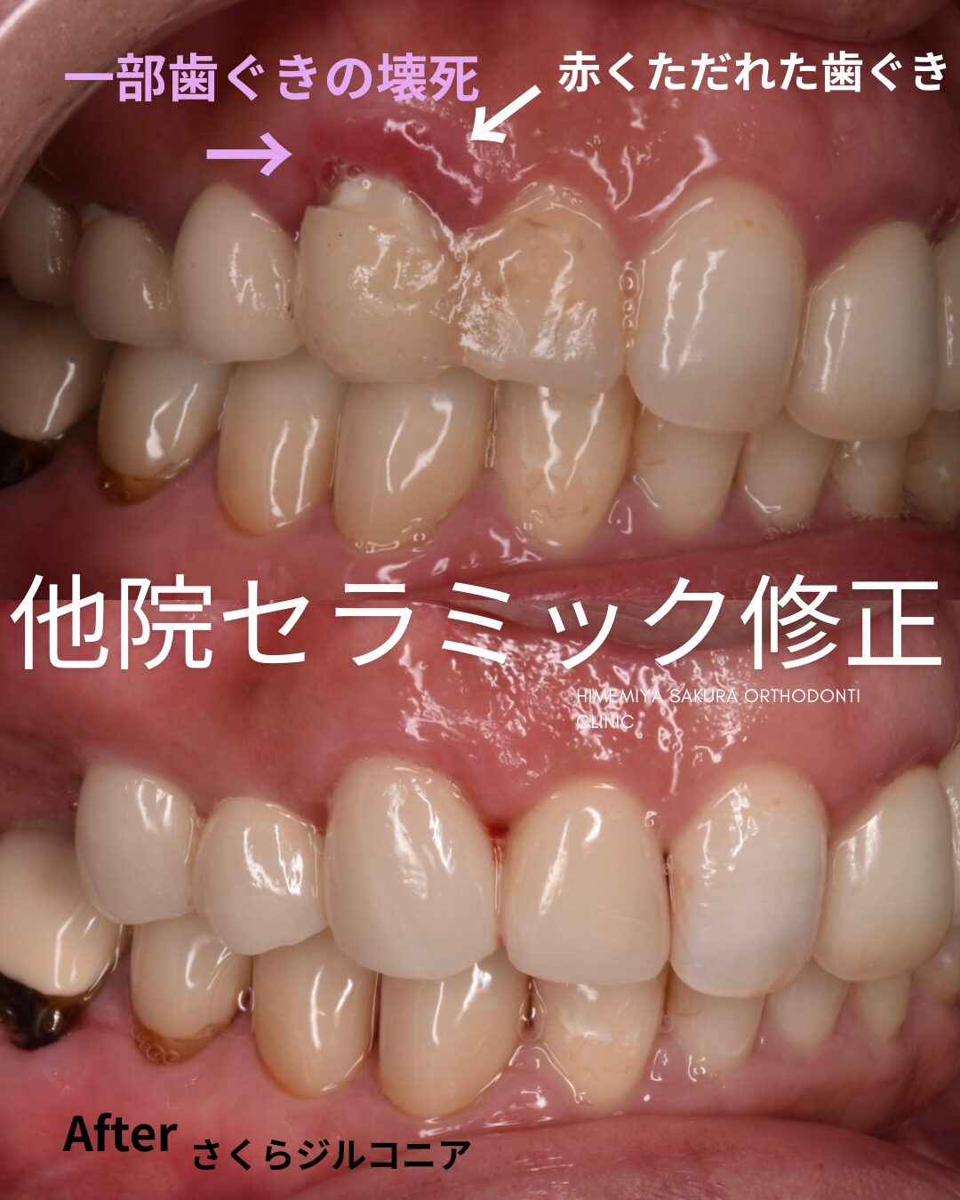 40代女性 当院への受診動機 もう失敗したくないという強い思い 40代女性 他院でセラミックのブリッジ治療をしていて本留めされたが納得できず当院にご来院くださいました。 歯茎は赤く腫れており、セラミックは犬歯で割れています。またそれを繋ぎ止めるかのように前の側切歯と仮蓋の材料で止められ、後ろの土台からは外れていました。 「噛んだ時の違和感や歯ぐきの腫れなど気 …