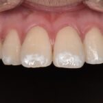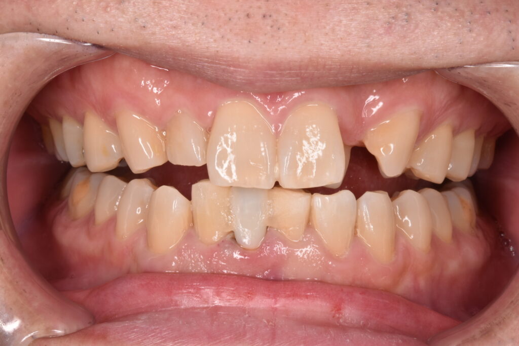 左右両隣は歯に1ミリの鋼線を使用して矯正用のゴムで折れてしまった歯を牽引しているところです。
