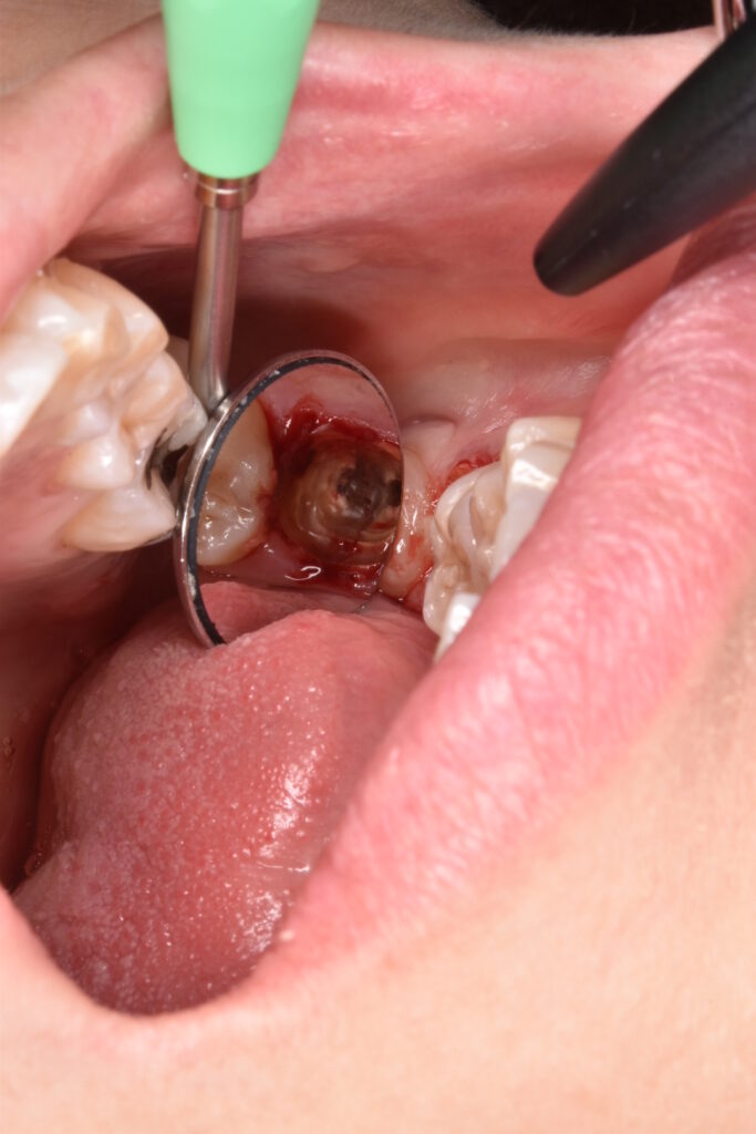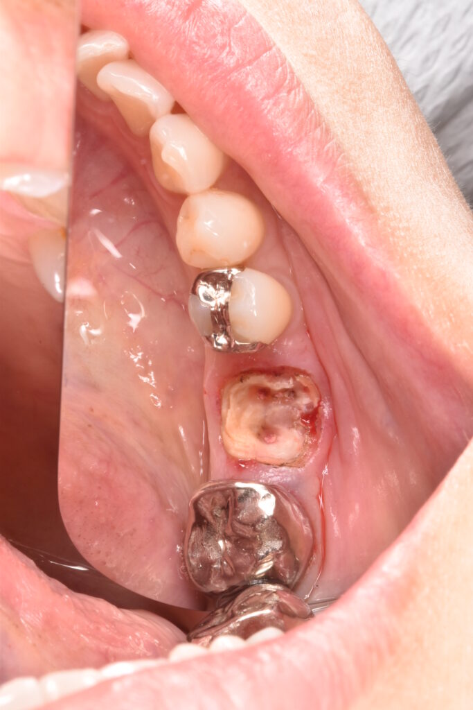 こちらの写真は奥歯ですが、被せ物がとれ、抜歯に至ったケースです。特に奥歯では歯の根本深くから割れて取れることが多く、状況的にかなり悪いケースがあり、初診の方に「初めまして、この歯は抜歯です」と宣告せざるを得ないこともしばしばあります。