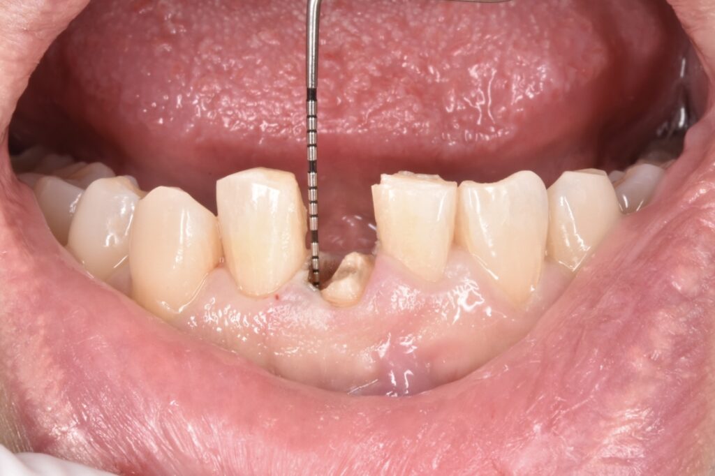 右下の前歯が差し歯でした。根本から折れていて一部が歯ぐきの中3ミリ近くに達しています。この破折縁から骨までは1ミリもなくこのままセラミックを被せても予後が悪いと説明させて頂きました。
