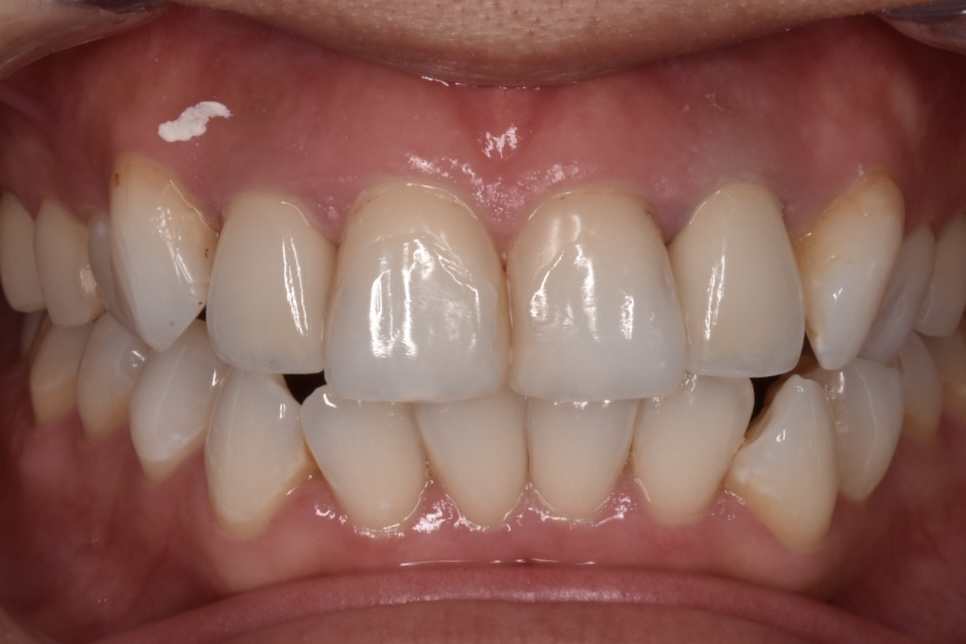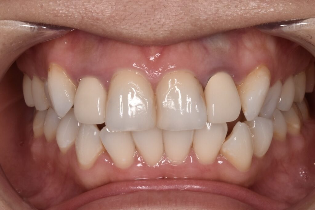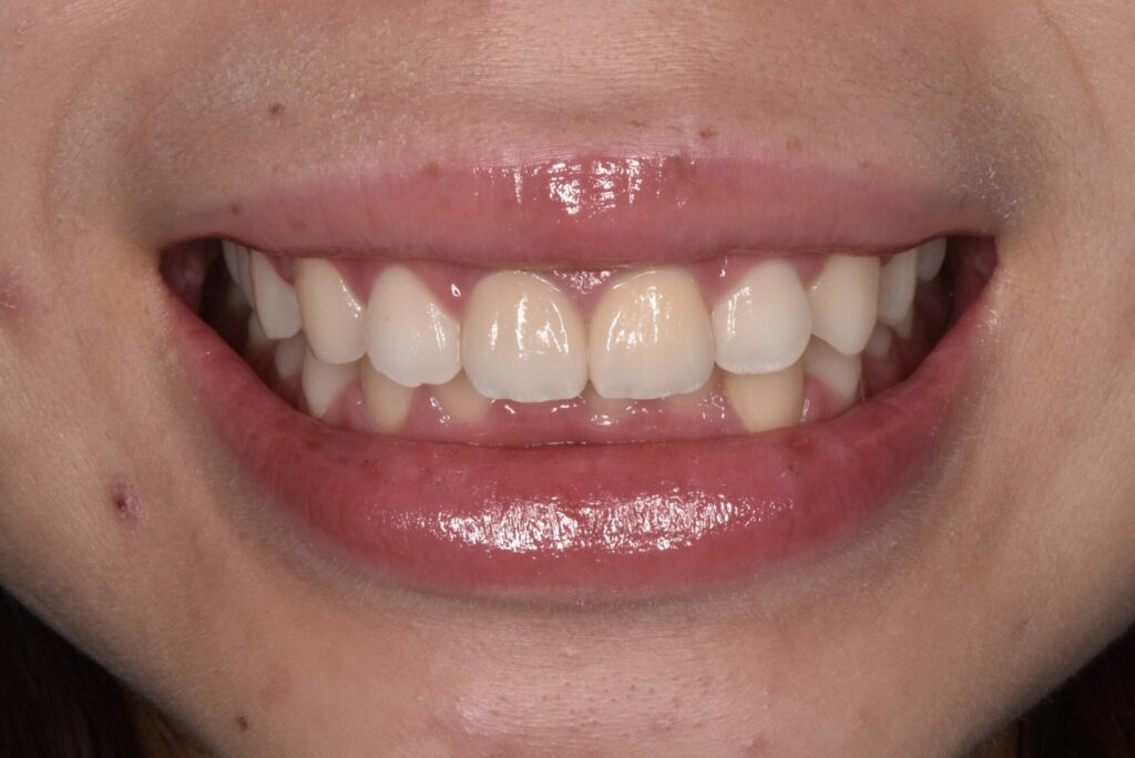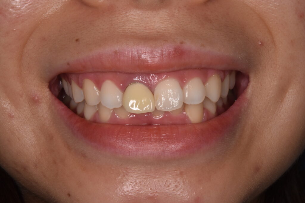 右の前歯の歯ぐきの黒ずみと古い被せ物のやりかえ治療をしています。歯の高さが左右で違うため歯肉整形をしています。*さくらセラミックプラン