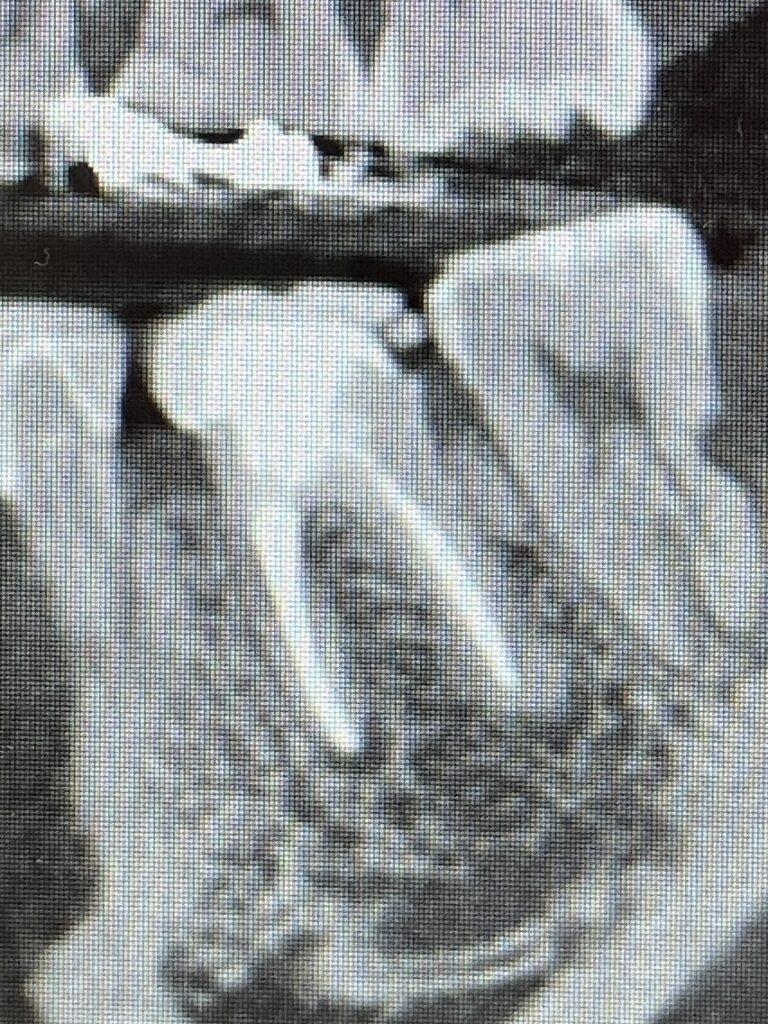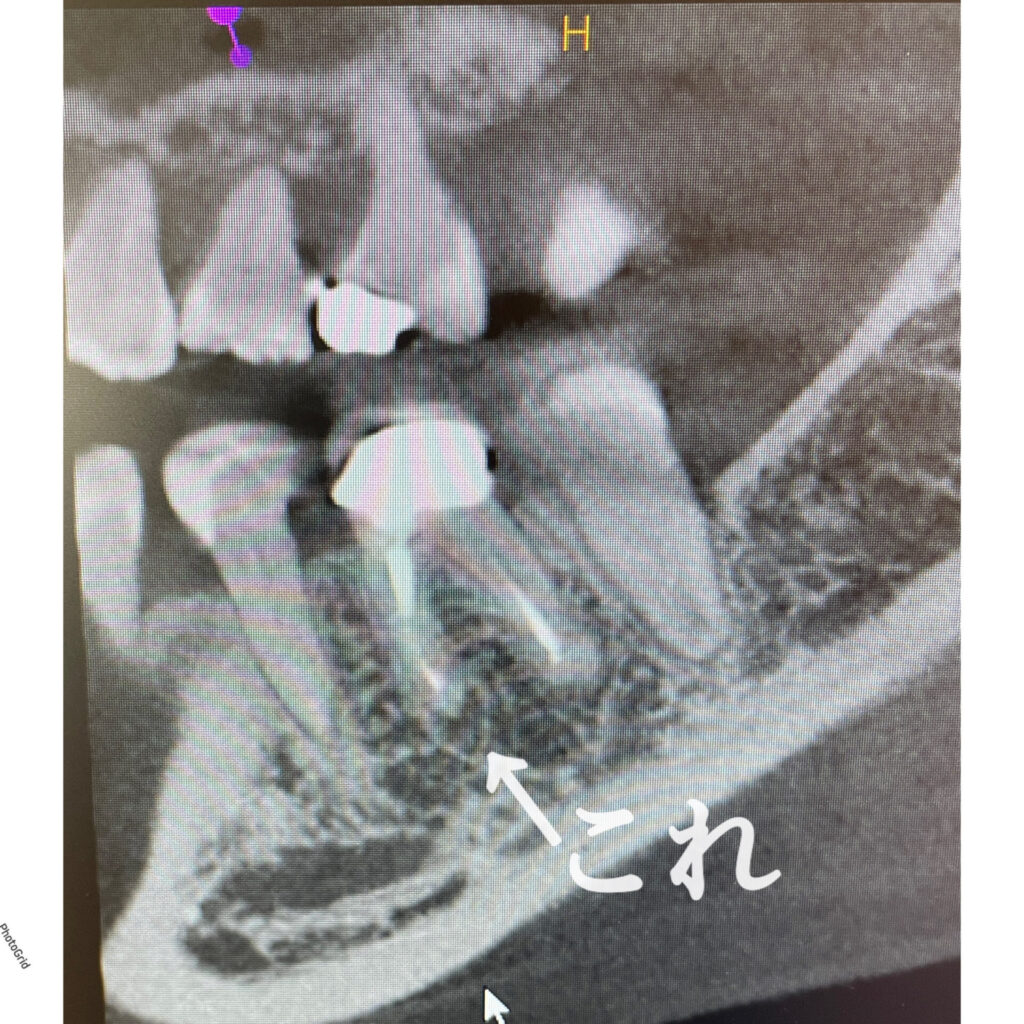 歯の根の先に少し膨れて見える影があります。これが痛みの原因