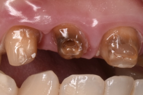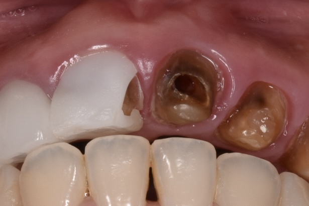 白い6連結のセラミックがありますが、右側のセラミックの前歯は破折しています。(写真左)また6連結の中央でジルコニアのフレームごと破折していることも確認できます。(写真中央)左の前歯は神経処置がされておらず穴だけ開いた状態でした。(神経治療途中?)土台6本全てが茶色から黒色に変色している事が周囲の天然歯と比べてもわかります。