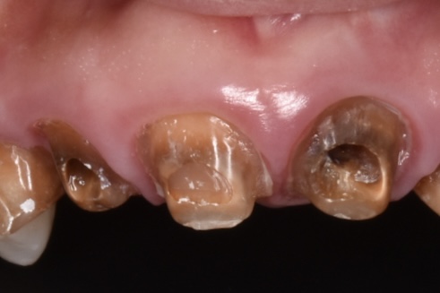 20代女性 20代前半の頃大阪にある有名審美歯科で前歯6本のセラミック矯正治療を受けた。強い痛みはないが、歯茎は赤黒く腫れていて真ん中で割れて、すでに連結してあるセラミックが脱落している状態です。とご相談くださいました。