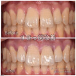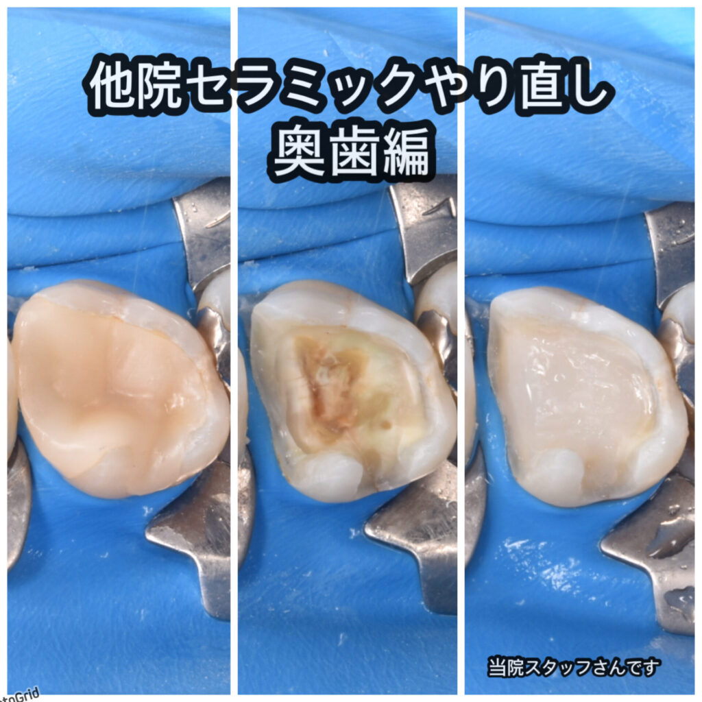 左:他院セラミックを外す前です。写真ではややわかりにくいですが歯の中央が茶色く変色し虫歯が透けて見えています。