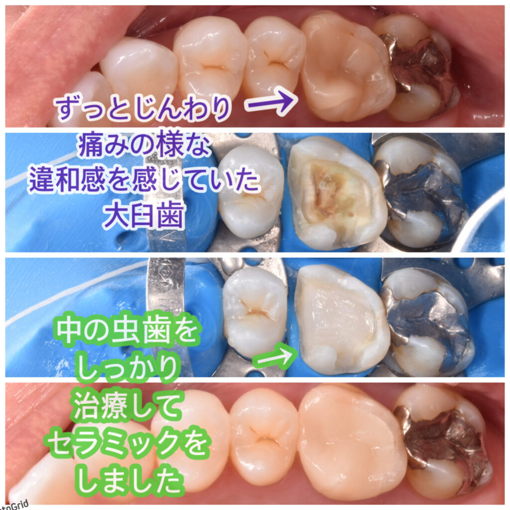 40代女性 歯科衛生士さん、何年か前に治療し、セラミックを被せたが違和感や時折痛みがありセラミックのやり直しと虫歯治療をご希望です。ずっとジンワリ痛いのを改善したい、最悪神経治療も必要と覚悟しているからこそ、ちゃんと治療したいとご希望されました。
