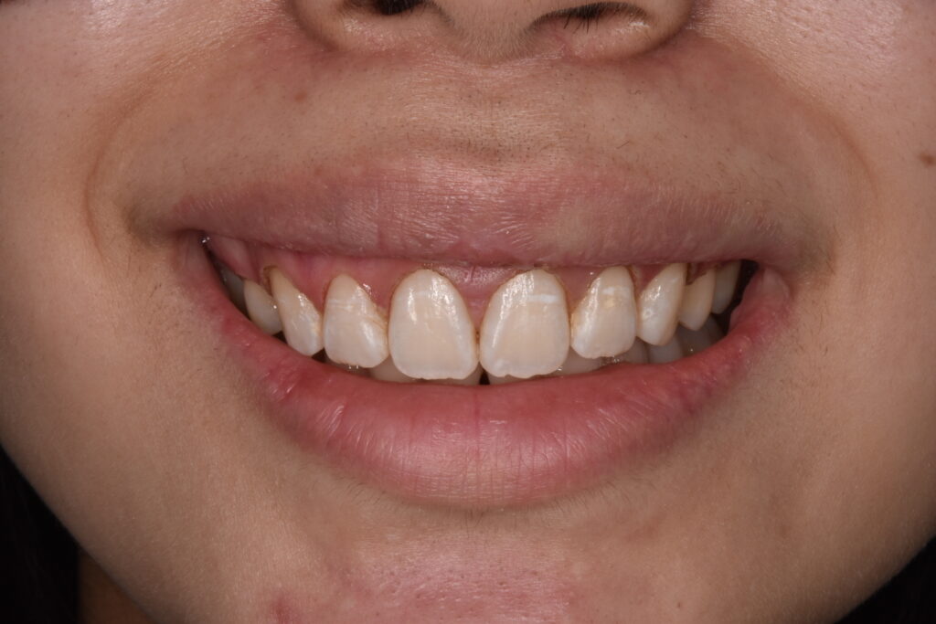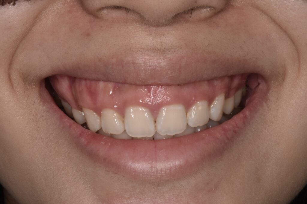 20代女性 ガミースマイルを歯肉整形で改善したいとご相談くださいました。ご本人様の適応としては上唇粘膜縫縮術と歯冠長延長術(クラウンレングス)の適応なのですが、今回はそのイメージを作りたいとのことで歯肉整形をご希望されました。