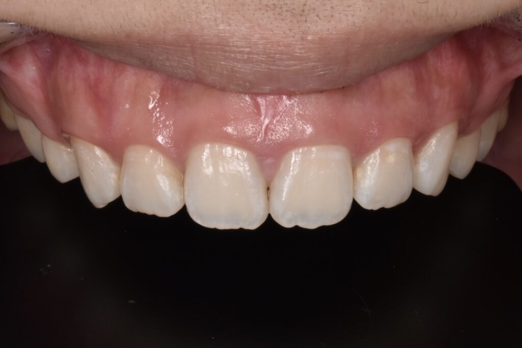 歯の長さが変わったのがわかります。また麻酔でリップが上がっていませんが、上唇粘膜縫縮術の術後やクラウンレングスの術後もこの状態と考えて頂き差し支えない状態です。2つの手術をすることで恒久的にこんな感じになると思われます。術後のイメージを持って頂くにはとても良いと思います。
