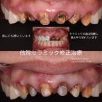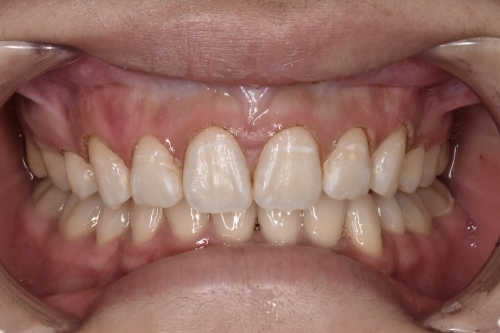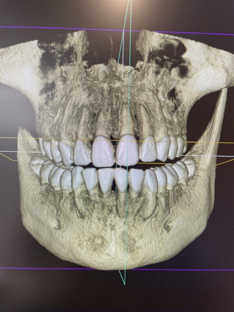 このCTの画像と術前の写真を見比べると歯ぐきの中にまだエナメル質が1/3ほど残っていることがわかります。また、歯槽骨のレベルもこのCTからわかりますので、モニター様のクラウンレングスの適応も診断がつきます。
