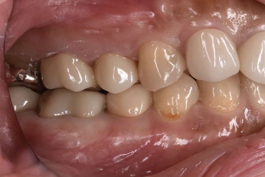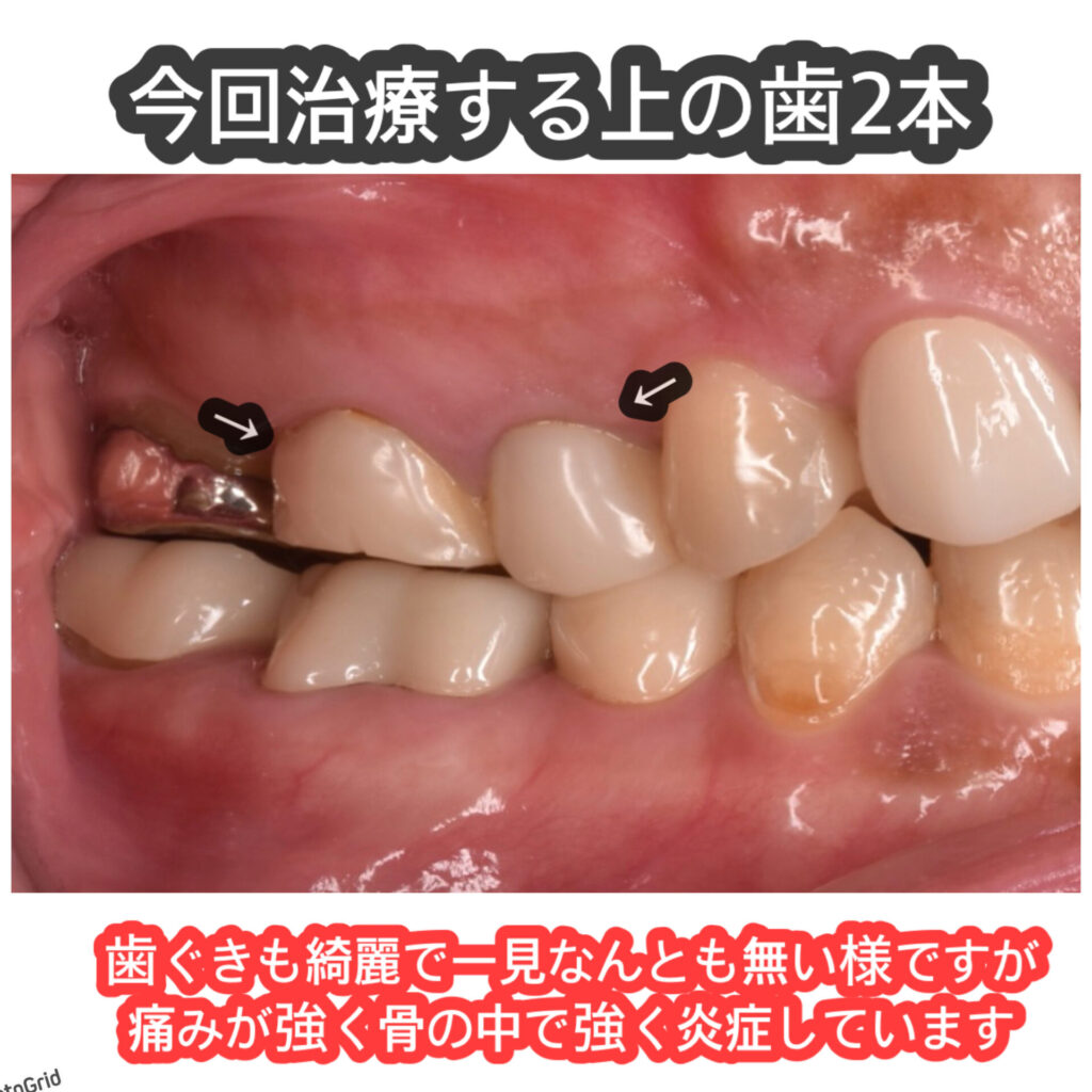 40代女性 昨年当院で前歯8本の他院セラミック修正治療を受けられた方です。右上の奥歯に痛みを感じ当院にご相談くださいました。かなり前に他院で保険治療された奥歯(第1大臼歯)とその手前の歯(第2小臼歯)の2本の治療が必要と診断し保険ではなく自由診療での治療をご希望されました。
