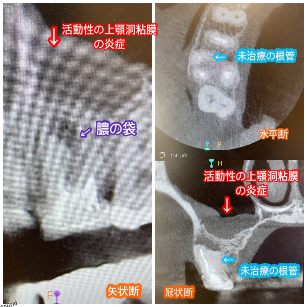 右上の奥歯2本に強い自発痛があり、レントゲンでの所見も根尖部に透過像(陰影)を認めます。打診も強く早急な治療が必要でした。ご本人様は保険での歯科治療は望まれておらず、費用がかかったとしてもちゃんと治したいとご希望されたため、詳細なCTを撮影しました。第2小臼歯と第1大臼歯の現状を説明させて頂き、どちらも根管治療のやり直しと、大臼歯に関しては未治療根管があり、そちらが中で腐り強い炎症を引き起こしていると考えられることをお伝えしています。
