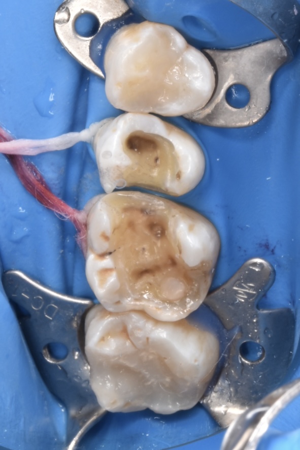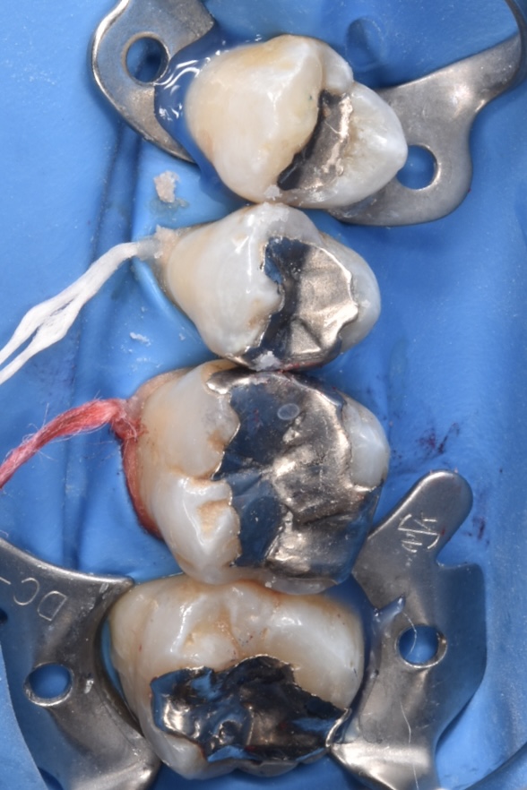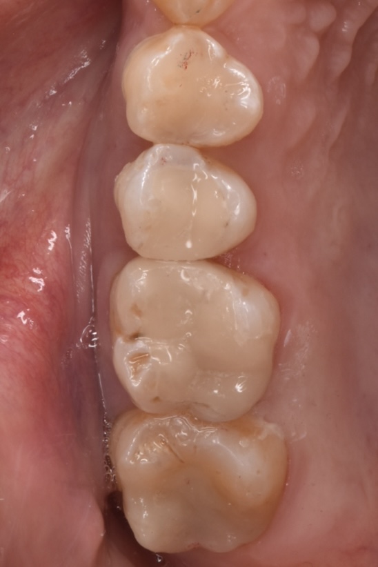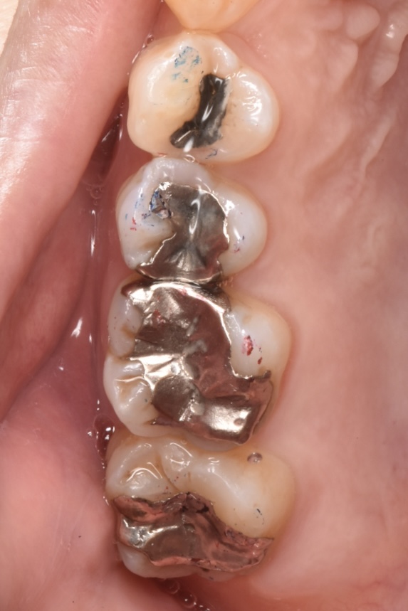 右側の上の歯列 第一小臼歯から第二大臼歯まで銀の詰め物が認められます