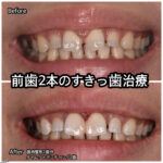 銀歯のやりかえ前後の写真です。第一小臼歯と第二大臼歯(写真では1番上と1番下)はダイレクトボンディングという手法で、虫歯治療から歯の形を作って修復する過程を1日で行っています。真ん中の2本はセラミック(e-max)インレーで修復していますので、1階目の治療で虫歯治療から型取りまで行い、2回目でセラミックのセットをしています。