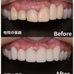 右側の黄色くやや外側に開いた様に見えるのが、他院セラミックです。費用と大手歯科医院ということで選んでしまいとても後悔されたそうです。