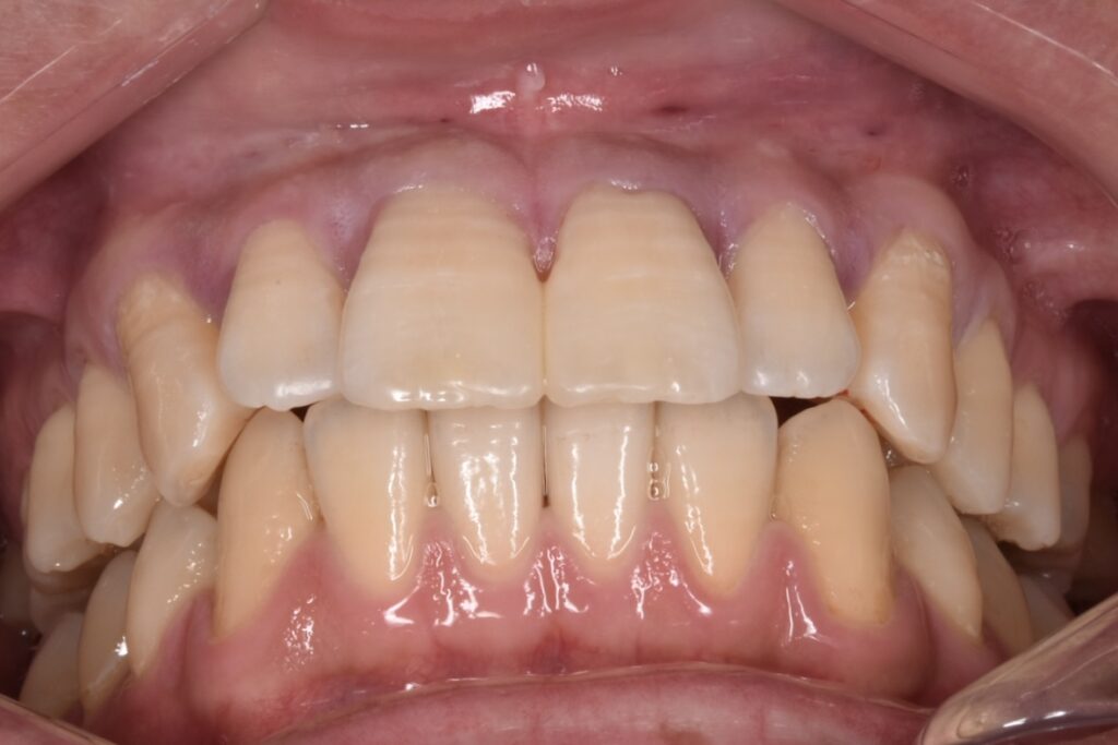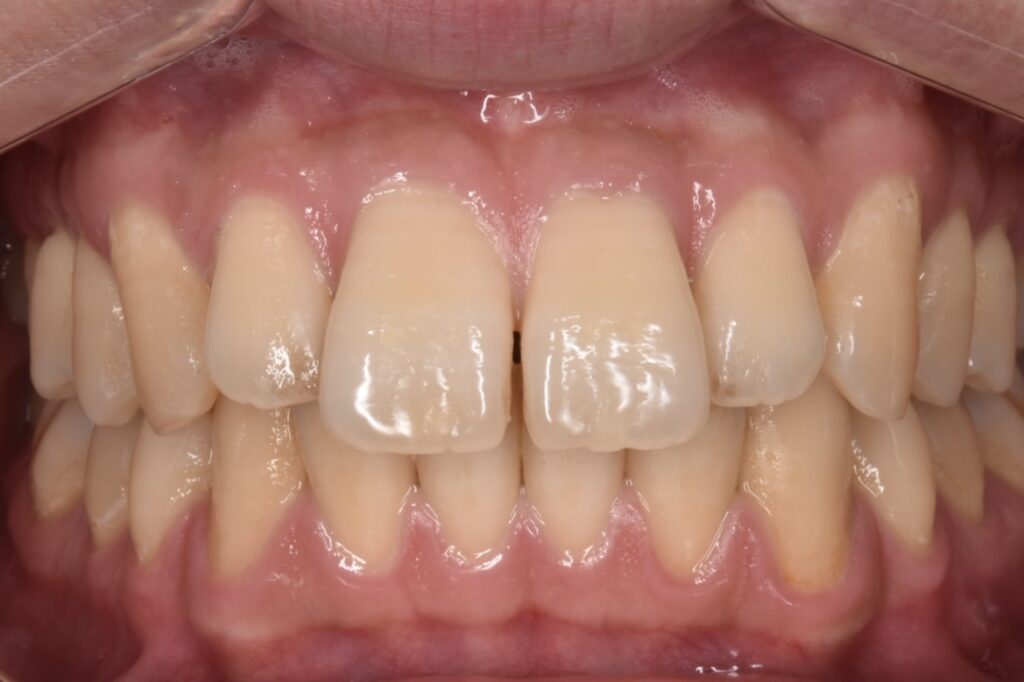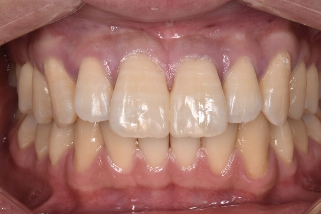 前歯の真ん中のに僅かにスペースがあります。その間に歯茎が線状に見えていますが、ここの歯茎はとても繊維質で硬く歯を寄せてもクッションのように弾かれてしまい、単に矯正をしてもすぐ後戻りしてくるタイプです。このようなタイプのすきっ歯にはダイレクトボンディングはとてもおすすめです。