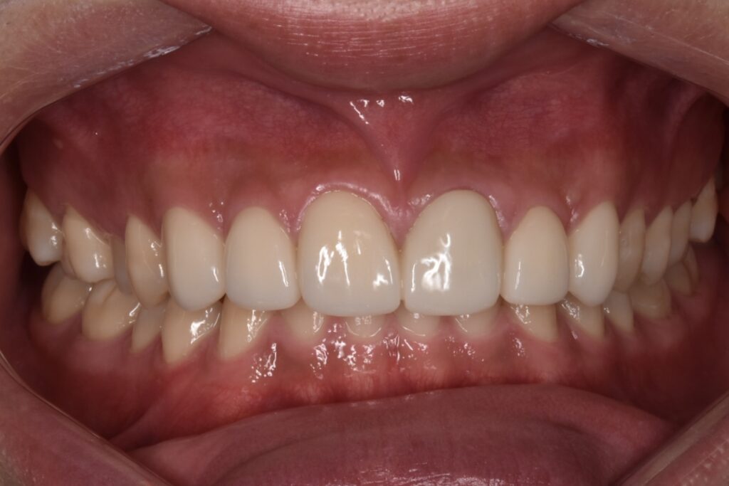 左の前歯がすでに保険治療で黄色い被せ物になっています。また前ばの隙間歯3−4ミリほとあり、さまざまなシミュレーションをさせていただいた結果、前歯6本でのセラミック治療をご希望されました。また前歯の黒ずみも気にされていて、同時に改善希望です。