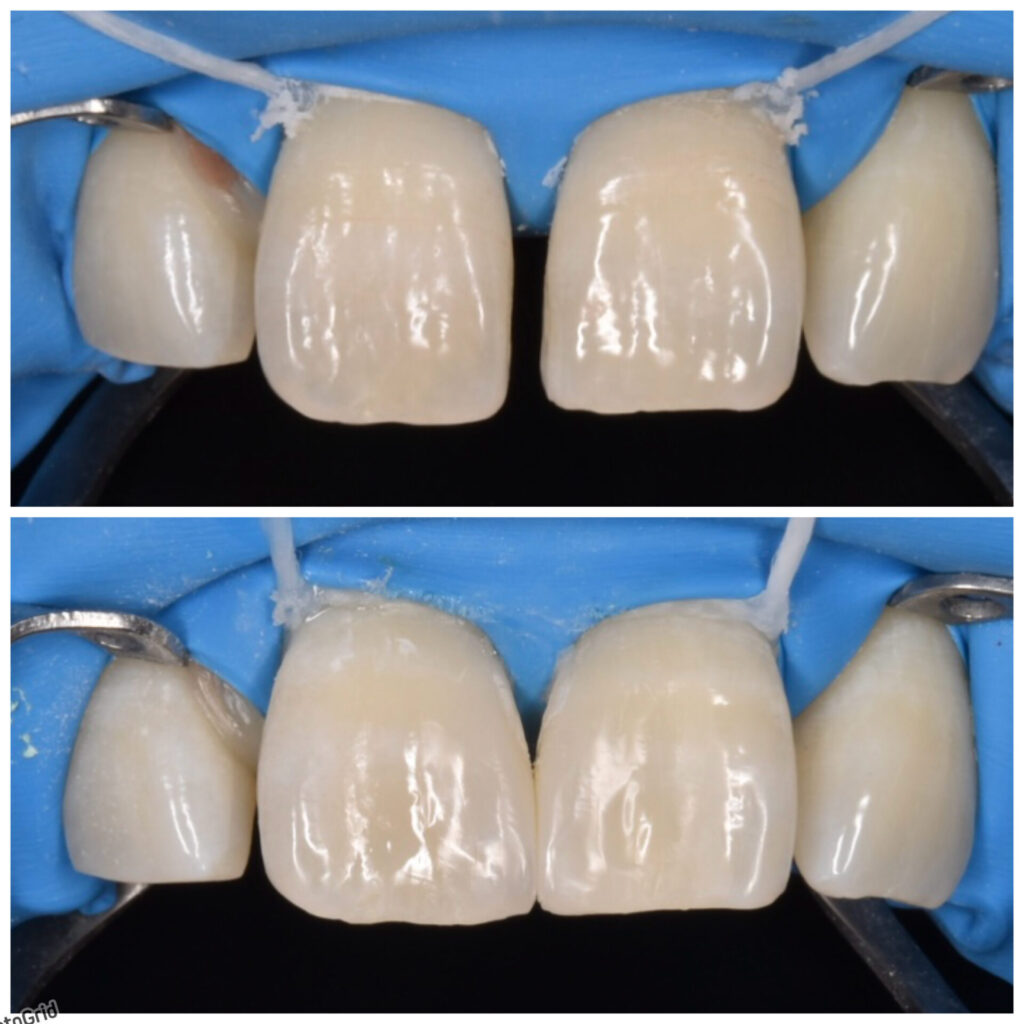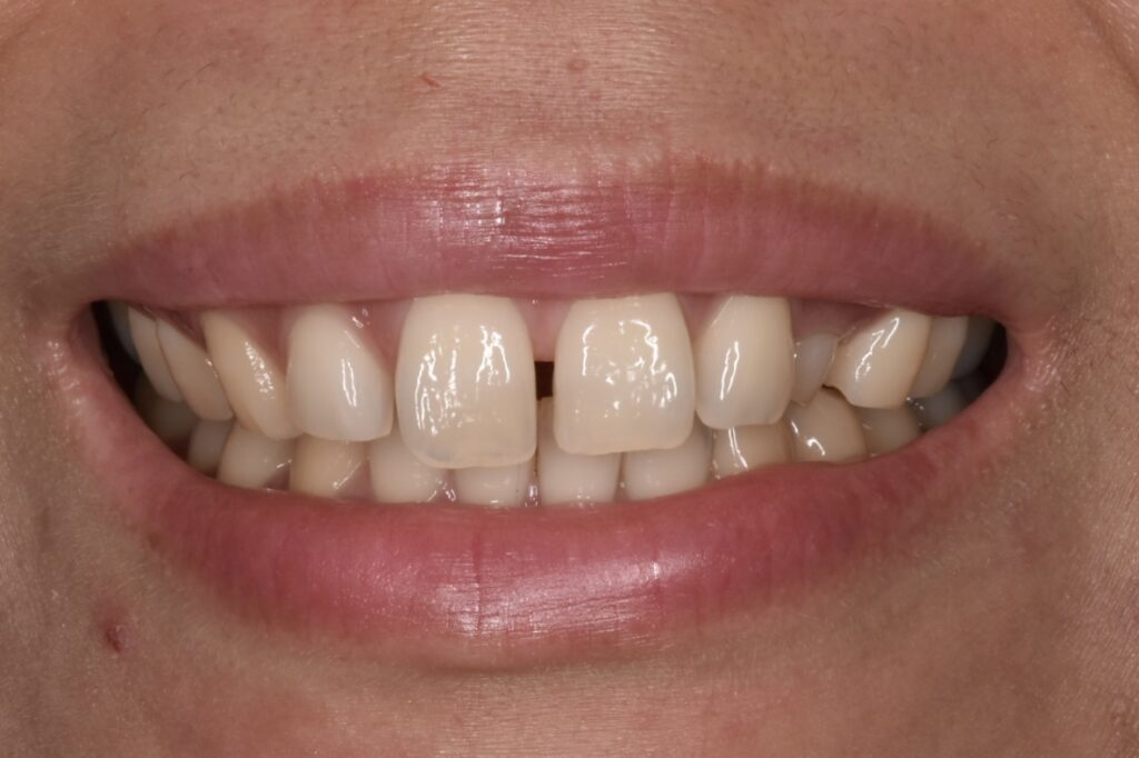 40代女性 前歯の真ん中の隙間があり、この改善を希望され当院にご相談くださいました。ライフスタイル的に忙しく矯正治療やセラミックでの治療ではなく1−2回の通院で終了するダイレクトボンディングという手法で改善することになりました。