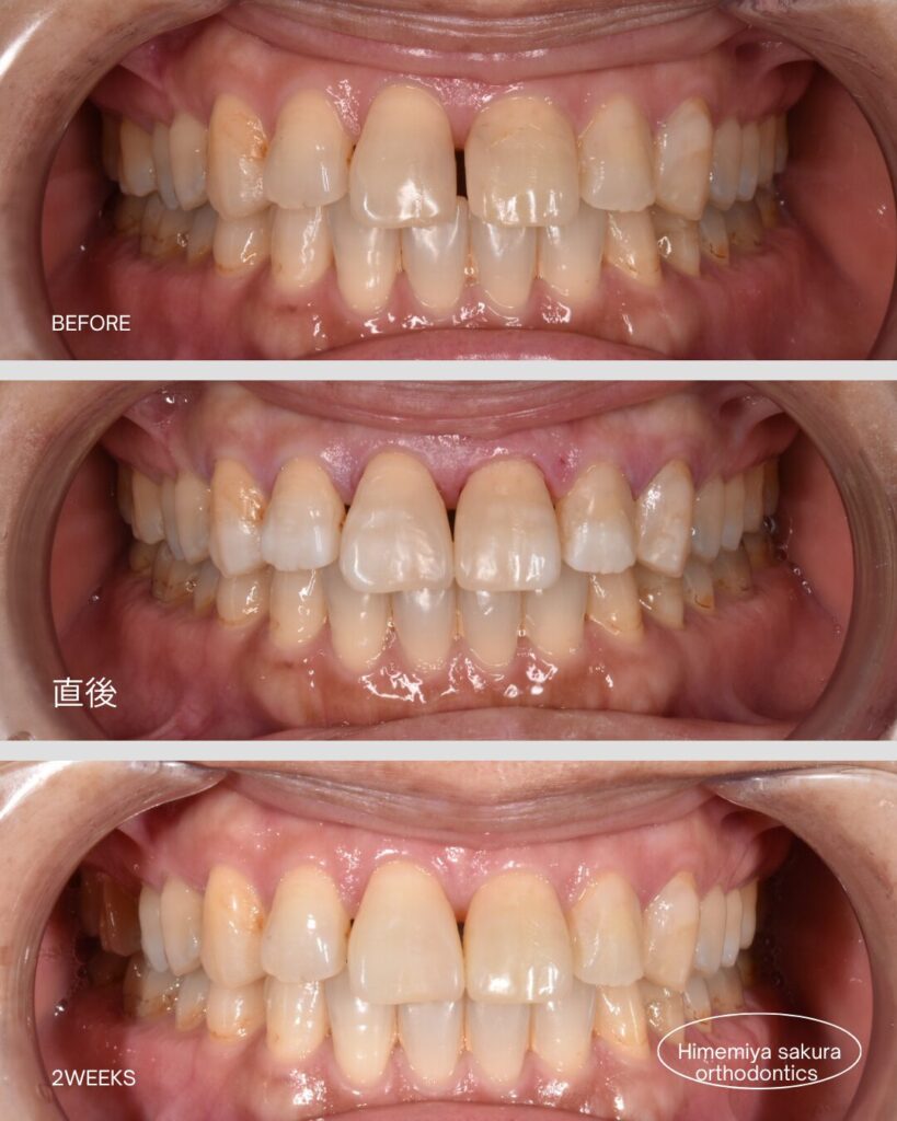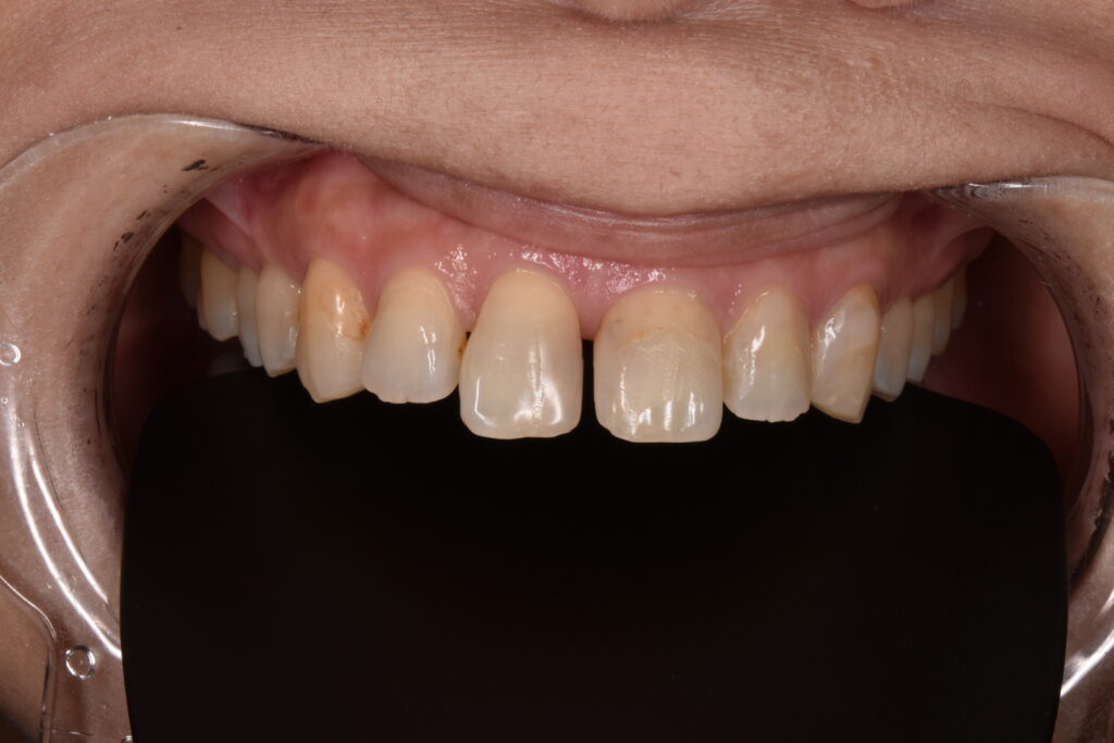 50代女性 前歯の隙間にコンプレックスがあって、いつも笑う時はその隙間を隠すように手で口元を隠していたとのこと。今回はその隙間をできるだけ矯正等で時間をかけるのではなく、その部分だけで改善したいとご希望されました。