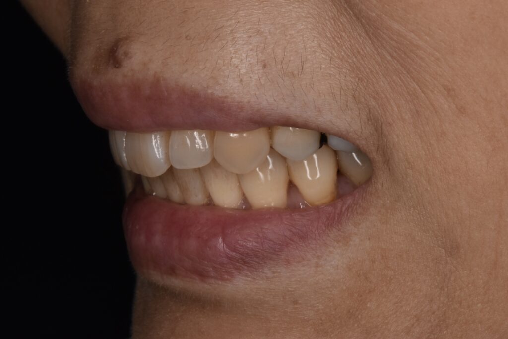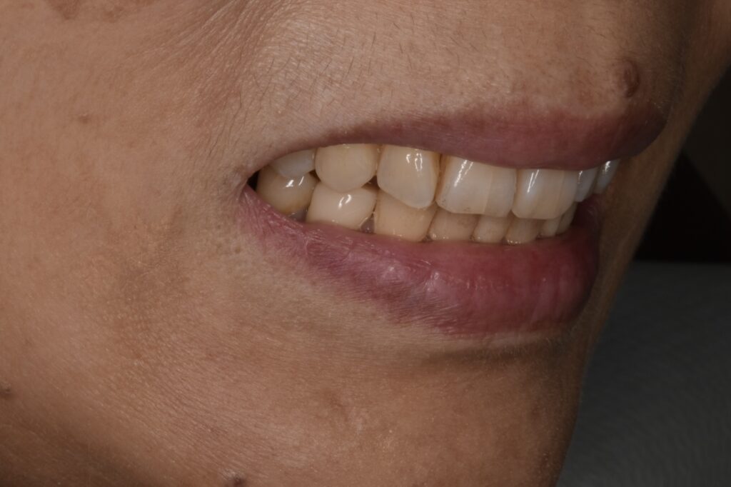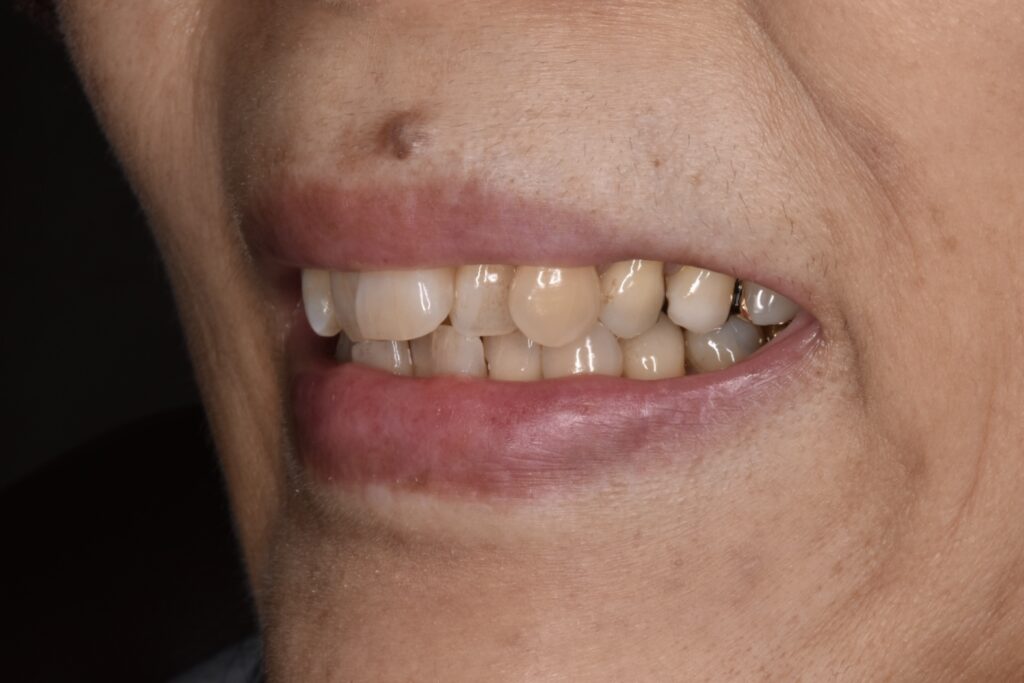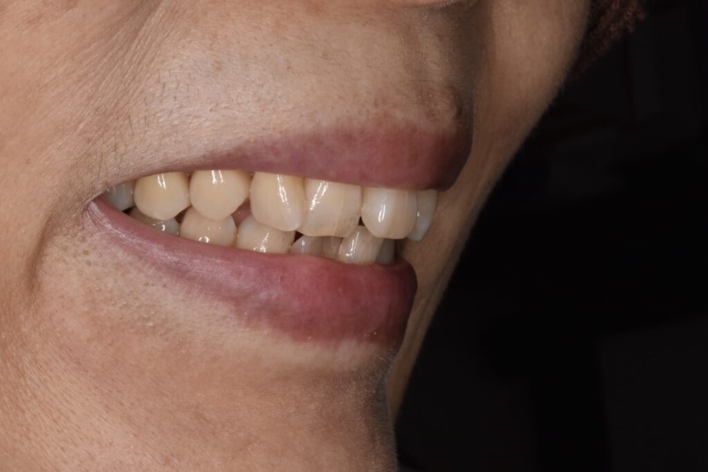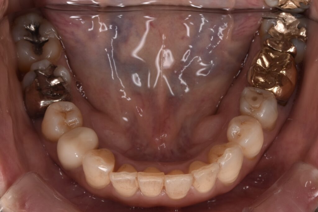 矯正開始後約1年です。叢生も改善されて噛み合わせも問題ありません。50代や60代からでもしっかりしていけば矯正できます。歯肉退縮もほとんどありません。