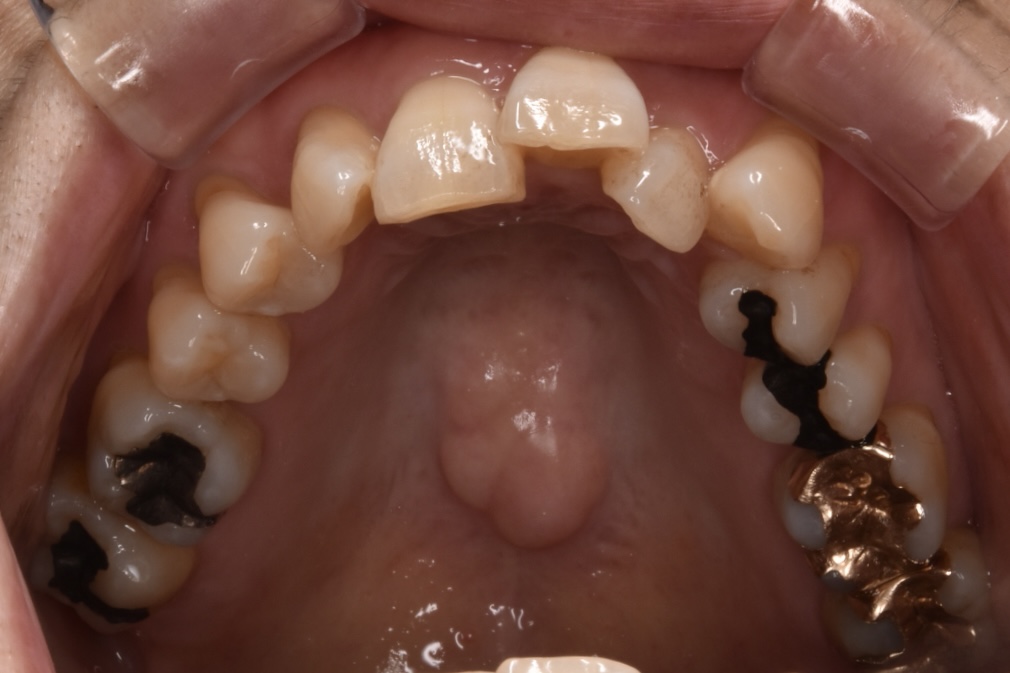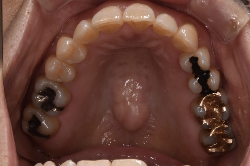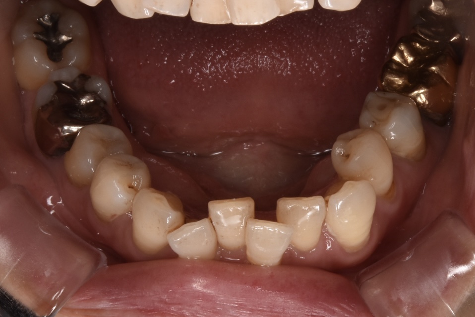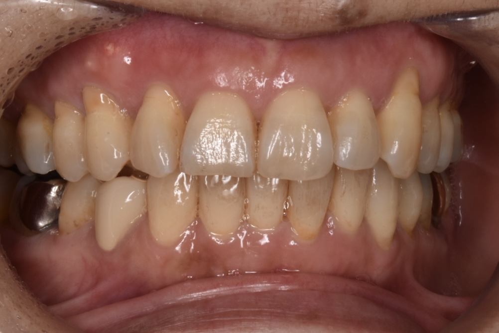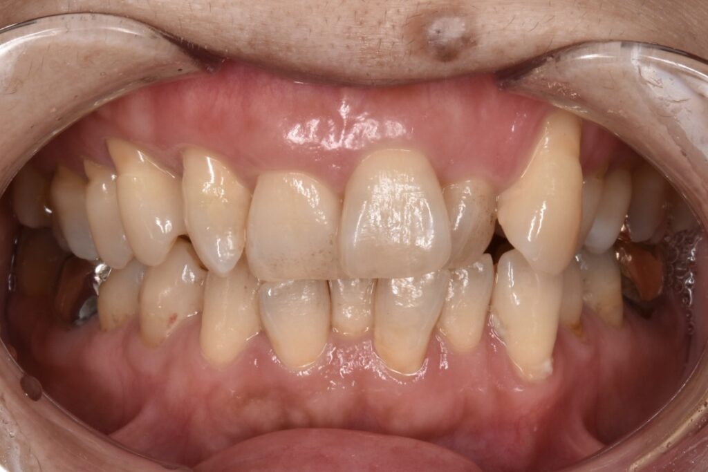 前歯を中心に叢生(ガタガタ歯並び)がみられます。